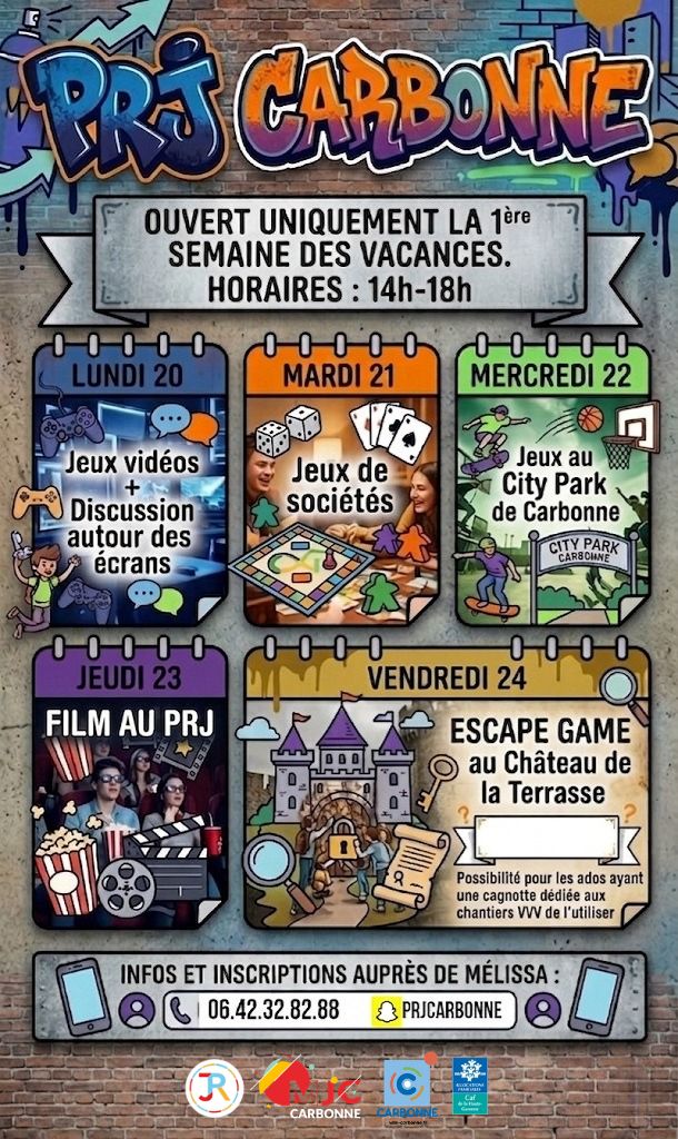Pendant les vacances d’avril, les jeunes ont notamment pu profiter d’un programme sur plusieurs jours, avec des activités différentes chaque après-midi. Au programme : jeux vidéo et échanges autour des écrans, jeux de société, jeux au City Park de Carbonne, film au PRJ, ainsi qu’un escape game au Château de la Terrasse.
