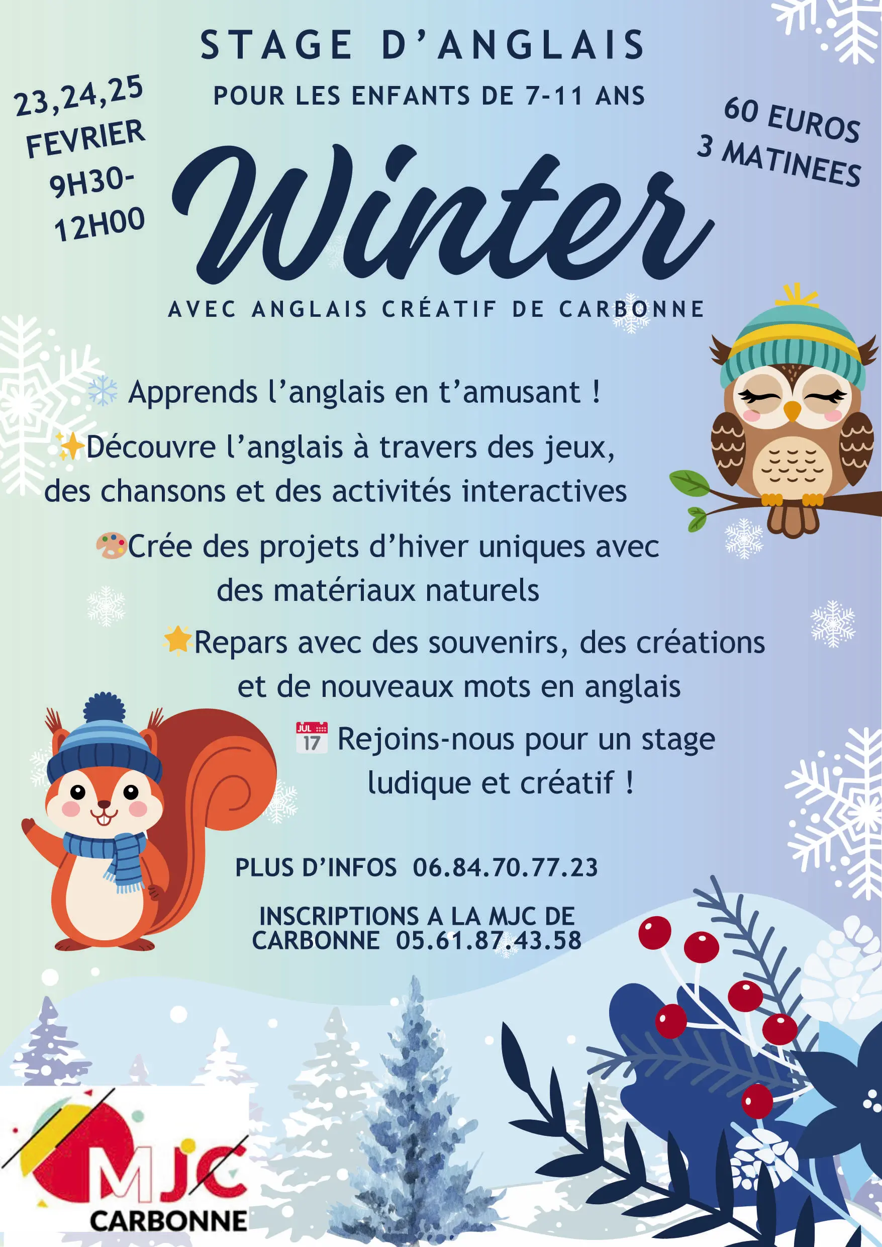 Pendant les vacances de février 2026, la MJC de Carbonne propose un stage d’anglais ludique et créatif, spécialement conçu pour les enfants de 7 à 11 ans.